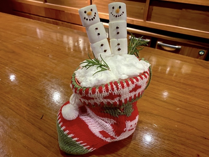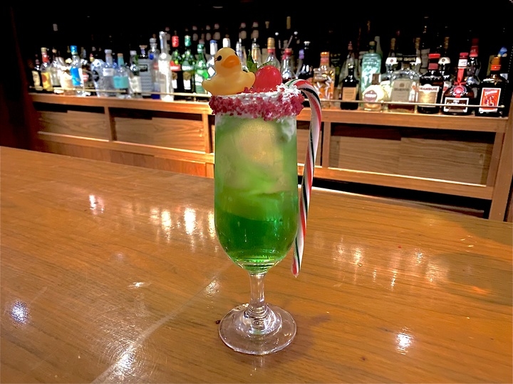 クリスマスブーツからスノーマンが生えているような可愛らしい見た目のカクテル。